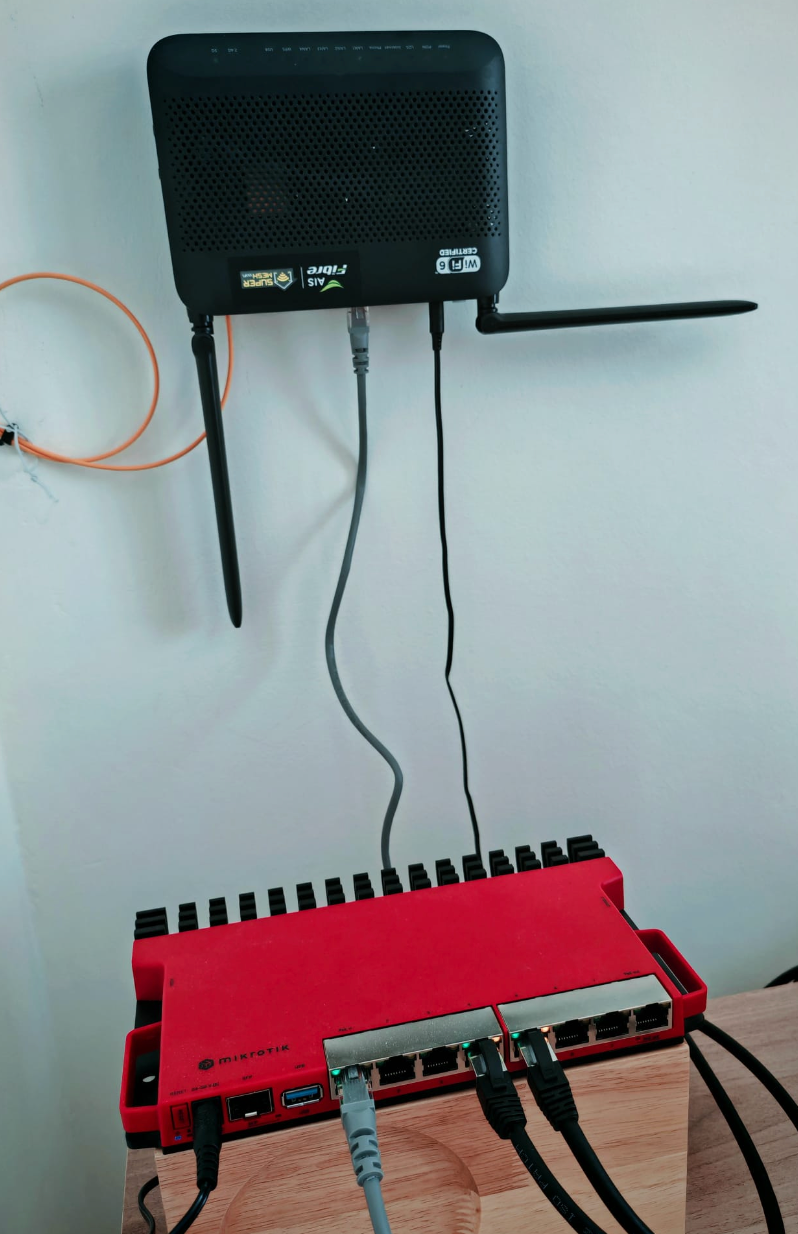 Verbinden Sie LAN1 der Fritzbox oder einem anderem Router mit dem LAN1 des MikroTik Router. Der AIS Router in meinem Fall läuft nicht im Bridge-Modus, da dieser leider nicht unterstützt wird.