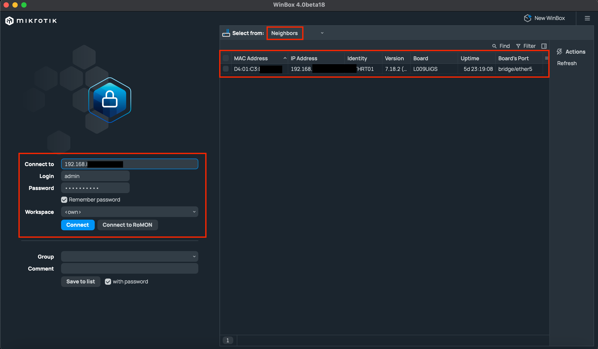 Starten Sie die WinBox Software. Ihr MikroTik Router sollte nun auf der rechten Seite unter Select from Neighbors gefunden werden. Mit einem Doppelklick auf den Eintrag können Sie danach links den Benutzernamen admin und das Passwort eingeben. Beim ersten Mal wird kein Passwort benötigt. Klicken Sie danach auf Connect um sich mit dem Router zu verbinden.