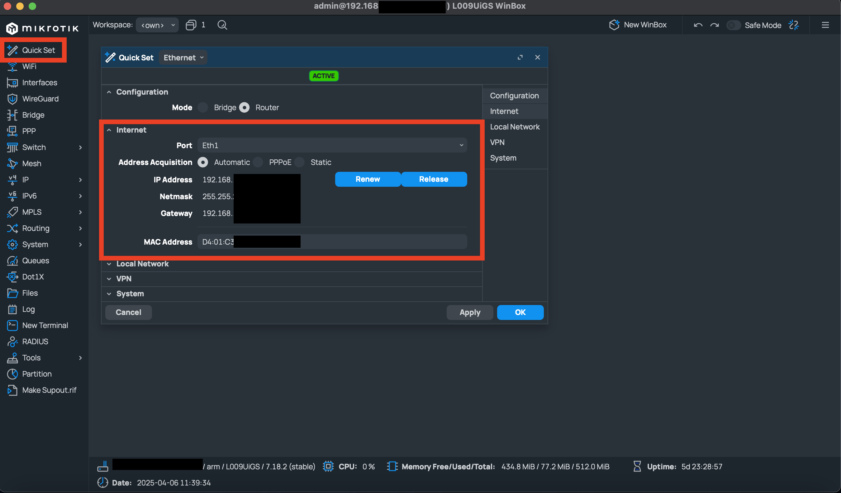 Unter Links Quick Setup und danach im Reiter Internet, sollten Ihr MikroTik Router nun eine IP-Adresse des AIS oder Fritzbox Routers erhalten haben. Sollte es nicht geklappt haben, dann würde unten keine IP-Adresse, Subnetzmaske oder Gateway angezeigt werden. Überprüfen Sie in dem Fall ob Sie das Netzwerkkabel an den korrekten LAN1 Port der Fritzbox/AIS und dem LAN1 des MikroTik Routers angeschlossen haben.